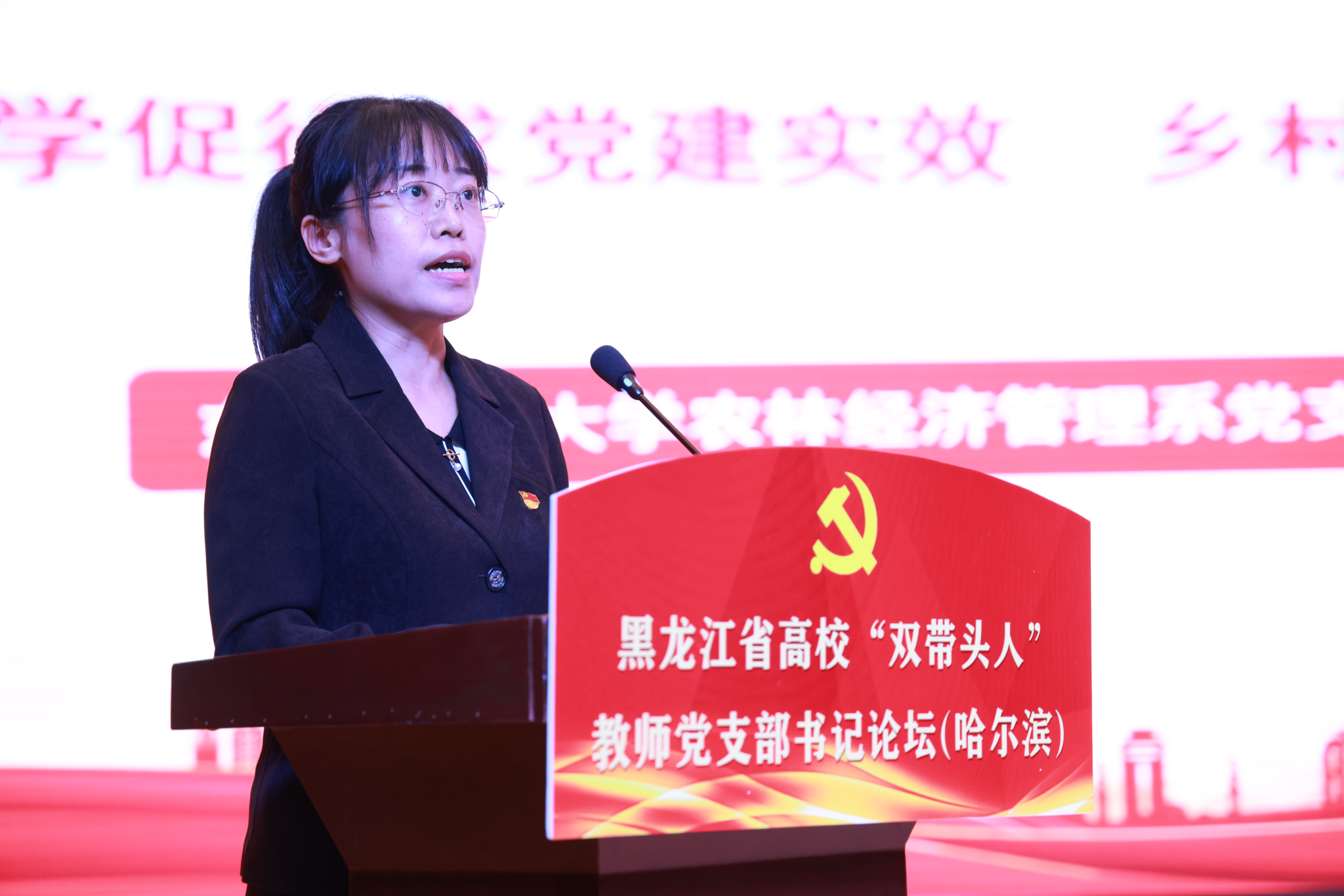 王洋在论坛上作了题为“以学促行求党建实效,乡村振兴谱龙江新篇”的主旨发言,分享了农林经济管理系党支部建设的典型经验做法与取得的成效。农林经济管理系党支部坚持理论学习与业务学习相融合,在政治素质提升中坚守初心;坚持支部活动与教学科研相融合,在业务能力提升中担当使命;坚持支部建设与高端智库相融合,在社会服务中大有作为。未来,农林经济管理系党支部将全面贯彻落实党的二十大精神,胸怀“两个大局”、心怀“国之大者”,在学校及学院党委的领导下,严格贯彻落实中央、省委、省委教育工委各项决策部署,围绕国家所需、龙江所要、学校所能和未来所向,坚持“谋长远、打基础、建制度、优机制、强管理、抓落实”的工作思路,以立德树人为根本,以强农兴农为己任,以“强政治,精业务,提动能”为标准,以“坚定政治信仰、提高素质能力、主动担当作为”为重点,全面提升支部党员理论素养,持续推动支部建设提质增效,全面实现党建工作与业务工作“双向奔赴、融合发展”,为高等教育内涵式发展提供坚强组织保证,为加快建设农业强省、奋力谱写全面建设社会主义现代化国家龙江新篇章作出新的更大贡献。
