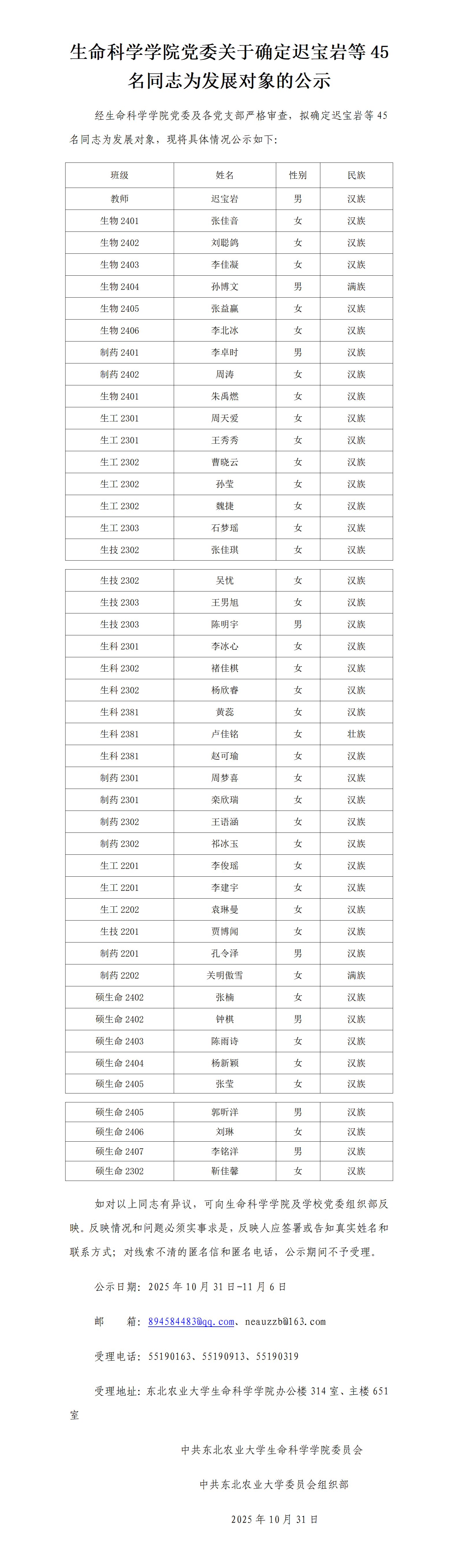 生命科学学院党委关于确定迟宝岩等45名同志为发展对象的公示