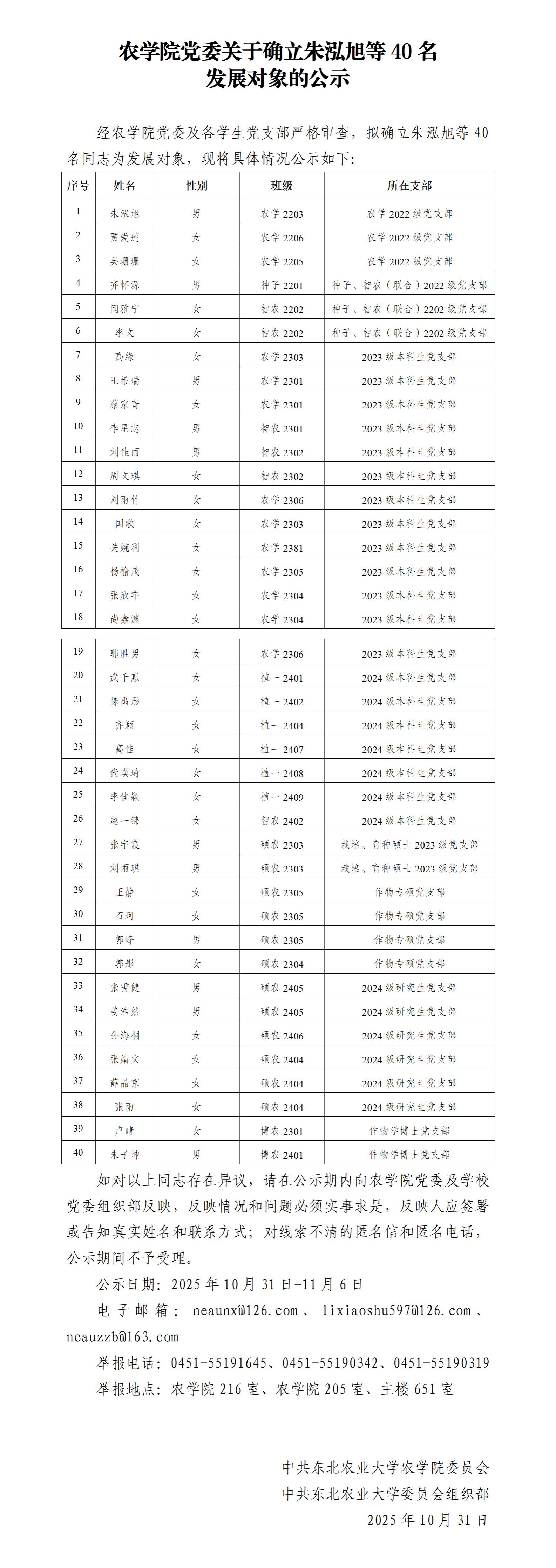 农学院党委关于确立朱泓旭等40名发展对象的公示