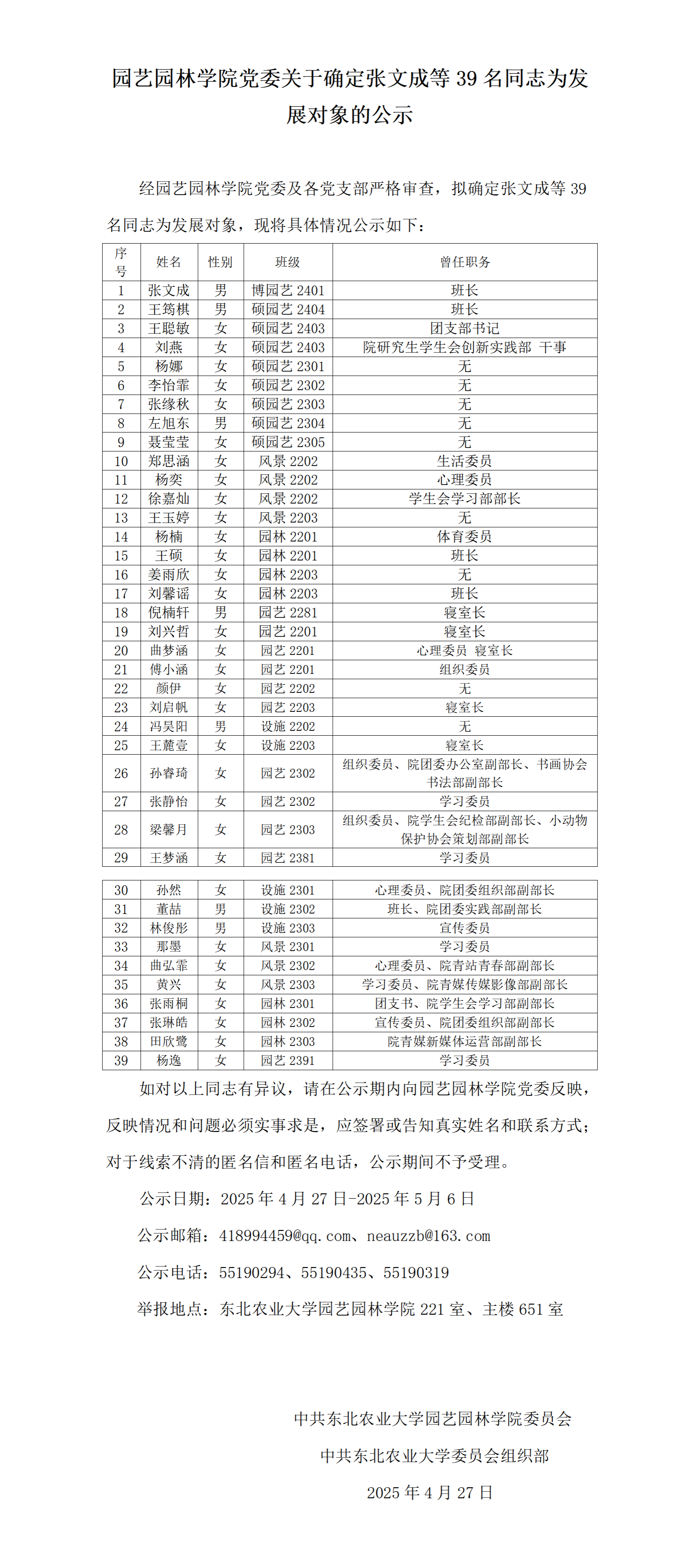 园艺园林学院党委关于确定张文成等39名同志为发展对象的公示