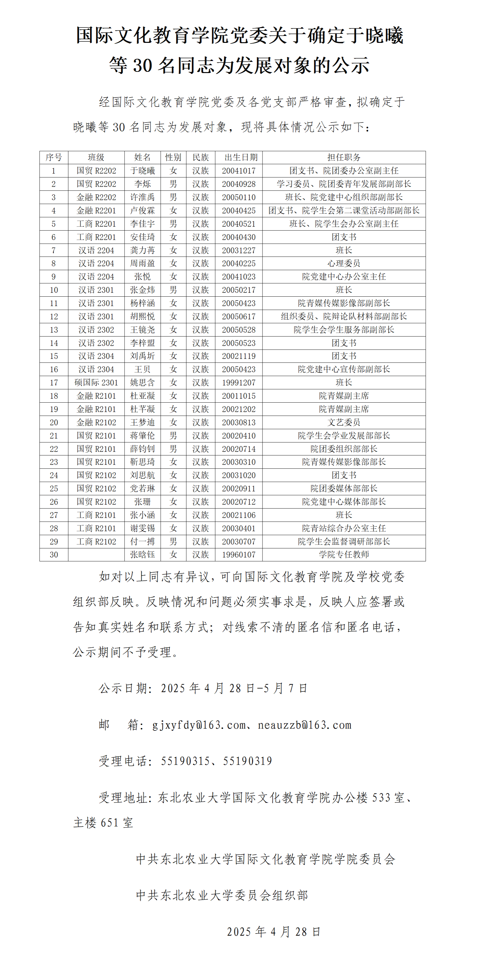 国际文化教育学院党委关于确定于晓曦等30名同志为发展对象的公示