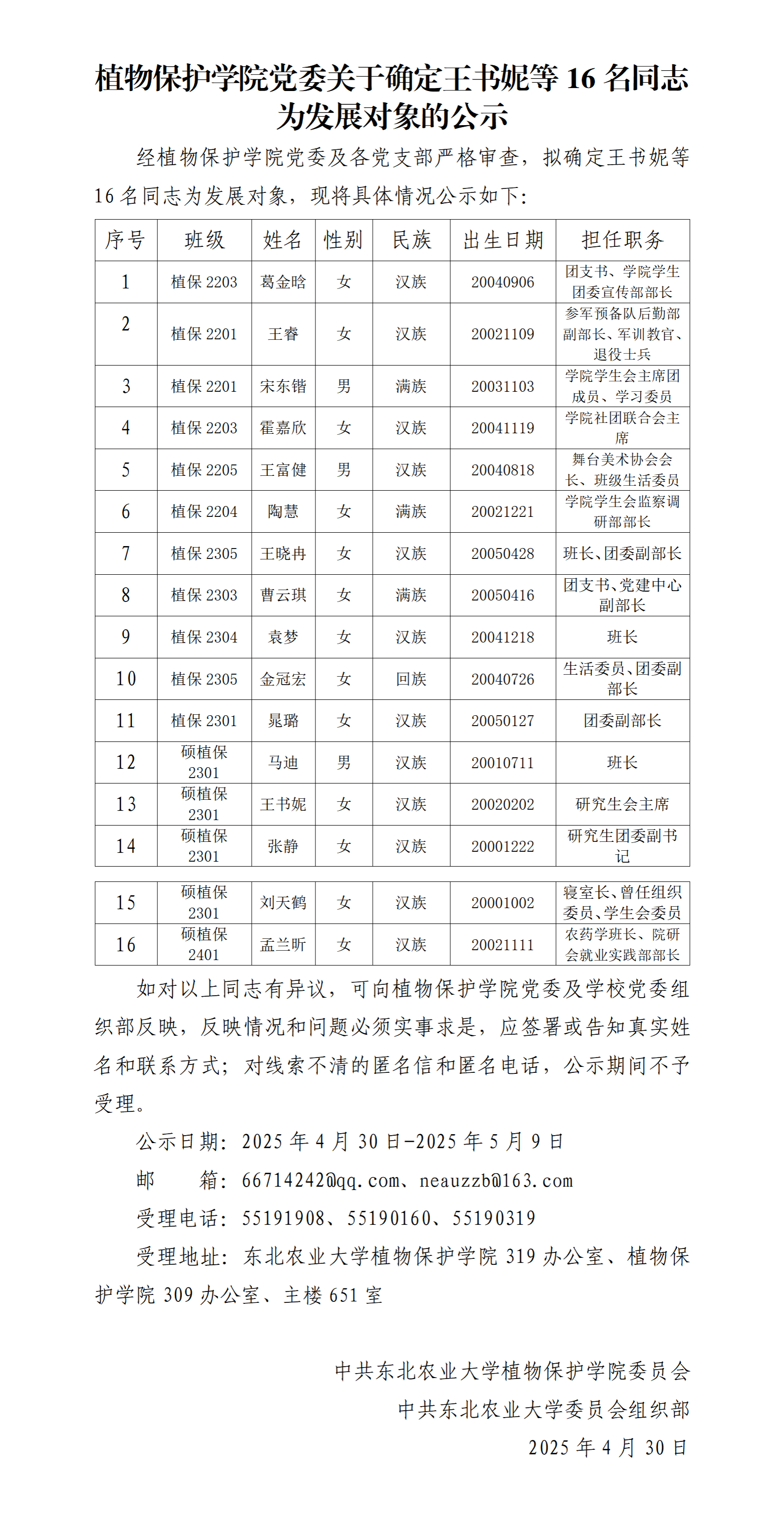 植物保护学院党委关于确定王书妮等16名同志为发展对象的公示
