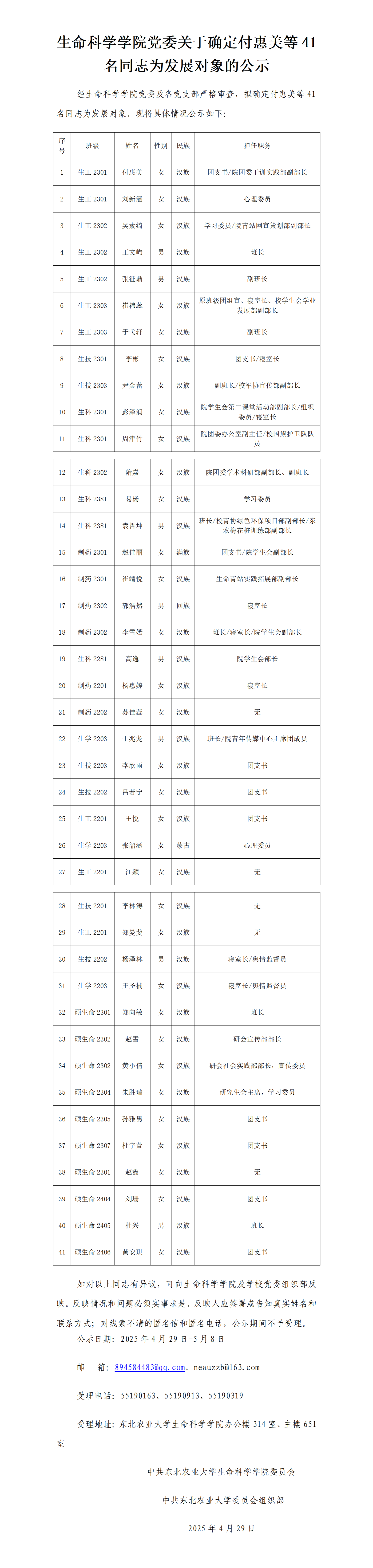 生命科学学院党委关于确定付惠美等41名同志为发展对象的公示