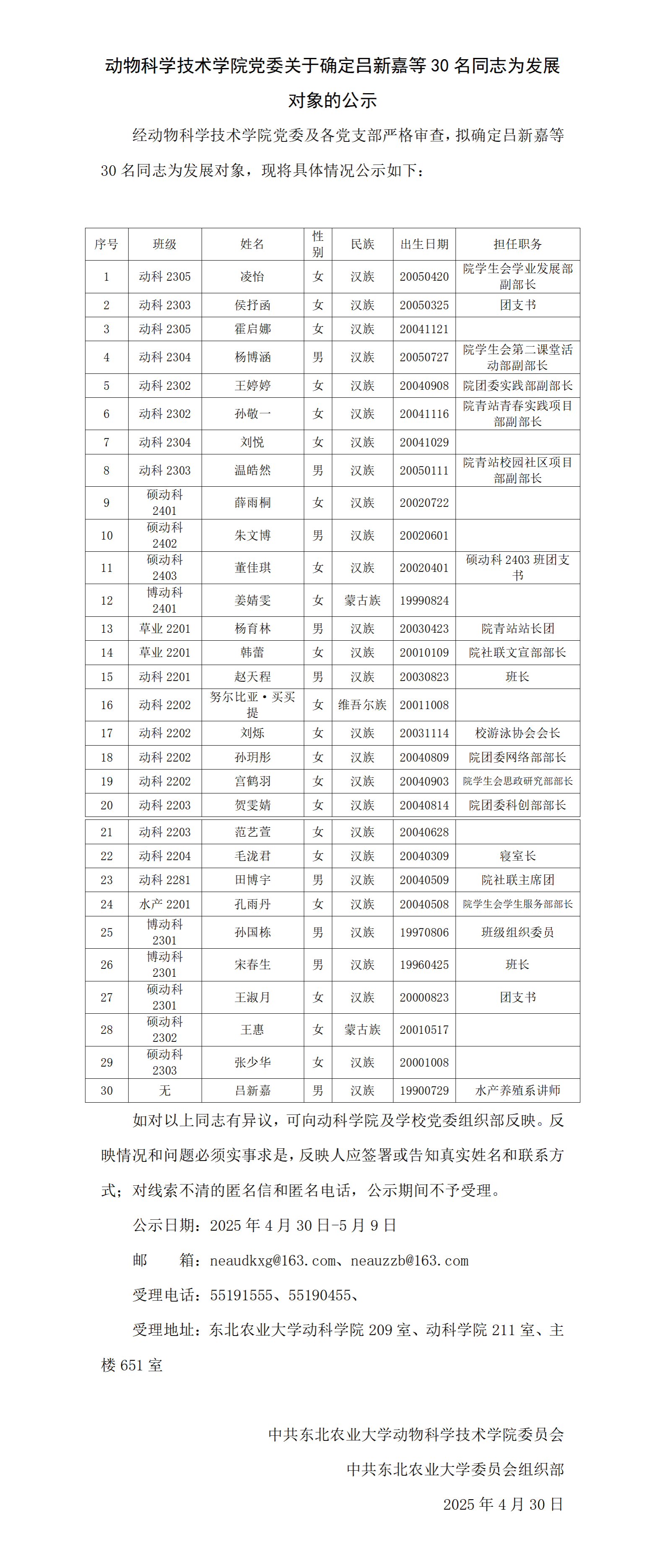 动物科学技术学院党委关于确定吕新嘉等30名同志为发展对象的公示