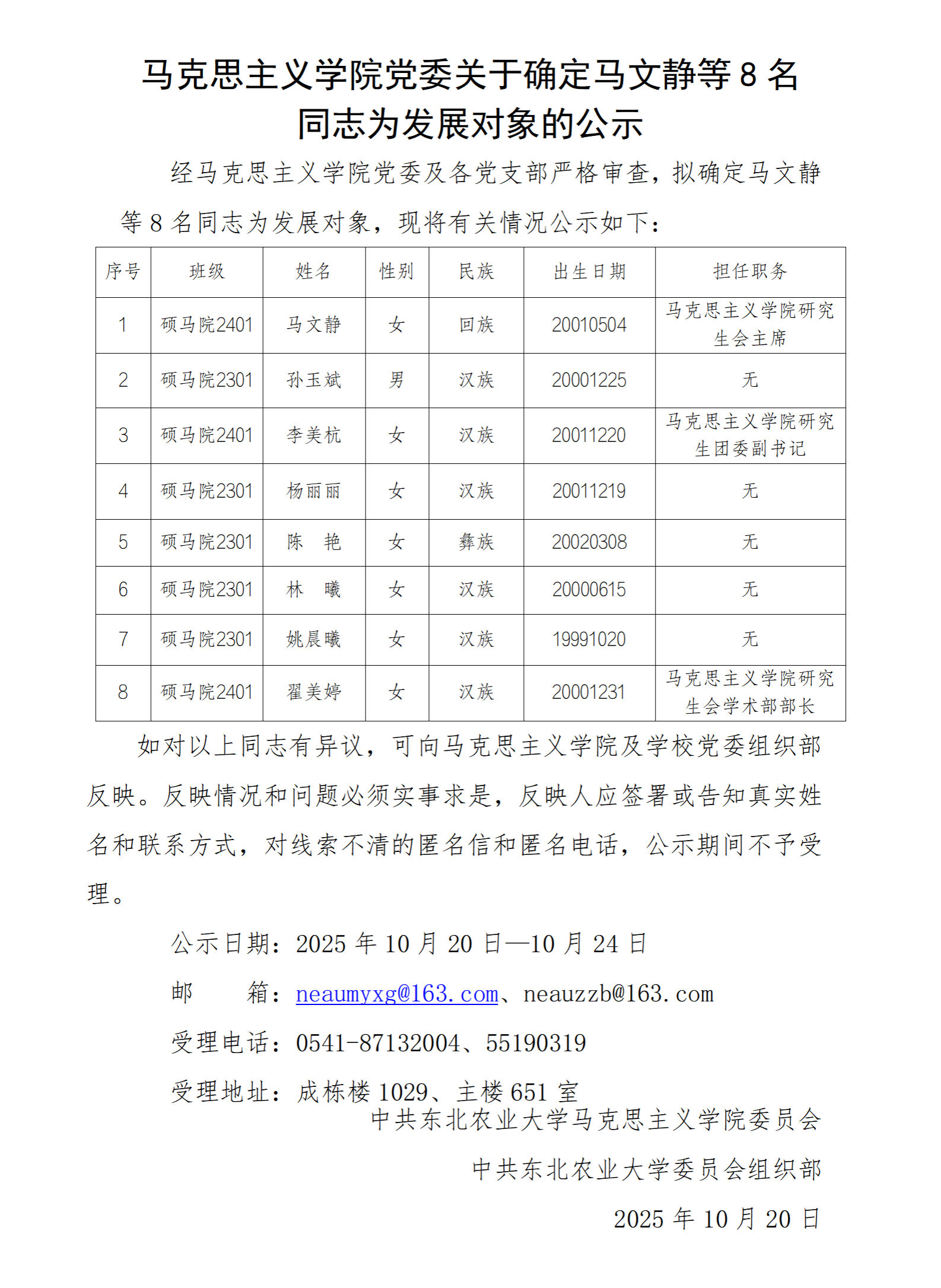 马克思主义学院党委关于确定马文静等8名同志为发展对象的公示
