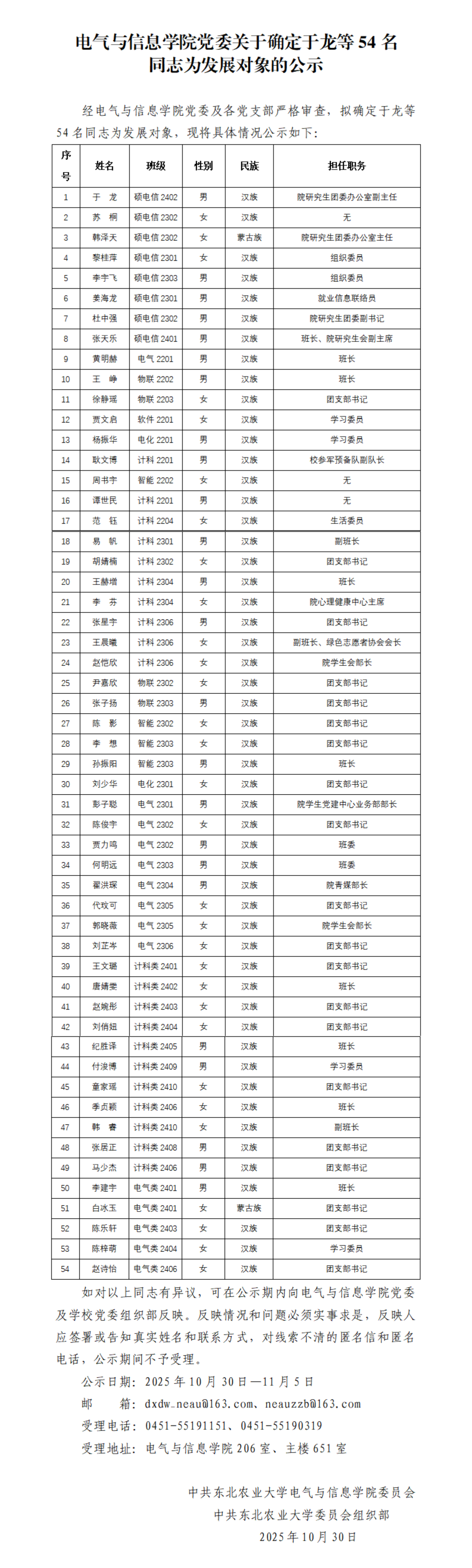 电气与信息学院党委关于确定于龙等54名同志为发展对象的公示