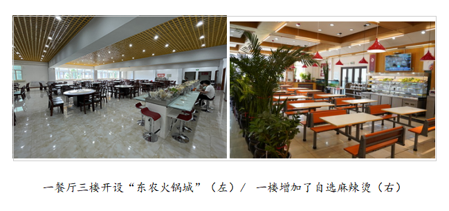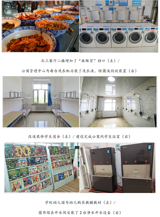 后勤服务保障是学校推进“我为群众办实事”的重要内容,力争满足广大师生对后勤服务的多样化需求。饮食服务中心不断丰富食堂餐饮种类,分别在南区一餐厅三楼开设“东农火锅城”、一楼增加了自选麻辣烫,北三餐厅二楼增加了“麻辣货”档口,为师生用餐提供了更多的选择;公寓管理中心为每台洗衣机安装了洗衣液、除菌液投放装置。为解决国际学院142名提前返校学生住宿问题,改造装修学生宿舍16间。探索服务新模式,在南区第十学生公寓试点建设完成公寓内学生浴室1个即将投入使用,提升服务质量,改善了学生的居住环境;学校幼儿园为幼儿购买教辅教材4类8种1500余本,延长班主任看护时间,切实解决家长因工作忙导致接孩子放学不便的问题;图书馆在开水间安装了2台净水开水设备,方便读者在馆期间的饮水需求。