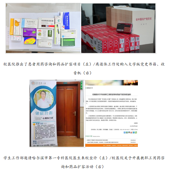 针对不同群体教职工的就诊、用药需求,校医院推出了患者用药咨询和药品扩容项目,目前,按需单独采购非储备药品23种,药品供应达410多种,丰富了药品种类,降低医疗费用,防范医疗风险;学生工作部与哈尔滨市第一专科医院建立医联体合作,为我校师生就诊开辟便捷通道。邀请该院王艳玲主任医师定期到校医院坐诊,为心理健康问题学生提供心理咨询82人次;离退休工作处购入大字版党史书籍、收音机200余台,主动送学上门,满足离退休老同志的党史学习需求,既保证党史学习教育实效,又体现有温度的人文关怀。