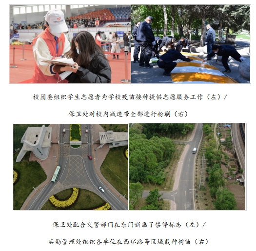 为落实新冠肺炎疫情防控指令,配合开展疫苗集中接种,校团委组织来自15个院系的1200名学生志愿者,每天从早上七点至下午五点划分为4个时间段,每个时间段60名志愿者上岗,不间断为学校疫苗接种提供志愿服务工作,总志愿服务时长超3000小时,为全校2万余名师生安全接种提供了有力保障;保卫处落实常态化疫情防控工作需要,调整开放学校北门出入通道,配合交警部门在东门新画了禁停标志,对校内39处减速带全部进行了粉刷,保证良好校园交通秩序;后勤管理处组织各单位在西环路等区域栽种山楂159棵、蒙古栎58棵、青楷槭、糠椴、红松等树苗700余株,扩大了学校绿化面积,进一步美化校园环境。
