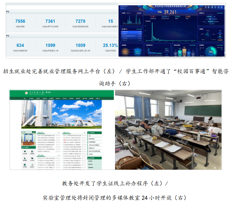 进一步畅通师生咨询、办事和意见反馈渠道,落实好校务服务“一网、一门、一次”改革要求。学生工作部开通了“校园百事通”智能咨询助手,7*24小时在线提供咨询服务,目前,系统已覆盖38个类别的近700个常用问题,及时解答学生问题37260人次;招生就业处完善就业管理服务网上平台,推进就业手续一站式办结,目前,平台注册应届毕业生7361人,注册率97.42%,有效解决了毕业生就业签约及改派程序繁琐的问题;教务处开发了学生证线上补办,教室使用情况查询,教师开、调、串、停、代课审批3个程序,让信息多跑路,办事师生少跑腿,简化办事流程,提升了工作效率。实验室管理处将封闭管理的多媒体教室24小时开放,为学生自习提供便利,提高教室利用率满足学生需求。