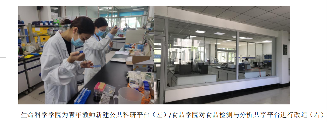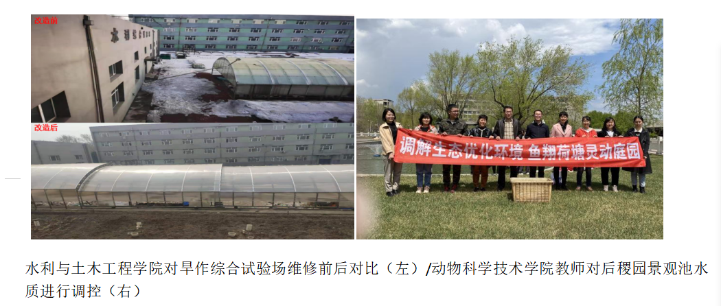 为进一步改善科研环境,水利与土木工程学院专门成立维修工作小组,完成对旱作综合试验场300平方米棚顶的维修,对电机和变速器进行检修,有力地保证教学科研工作顺利进行;动物科学技术学院水产养殖系师生发挥专业优势,利用菌藻均衡水质调控技术对后稷园景观池水质进行持续调控,投放鳙鱼、鲢鱼、锦鲤等十余个品种1000余尾,在确保景观池优质生态系统的同时推动了学生教学科研实践;生命科学学院建立4个二级公共科研平台,总面积850平方米,设置7个公共实验室,解决了青年教师科研条件不优问题。建设校内本科实习用地6亩,解决了植物学课程“校内实习难”的问题,同时美化了校园环境;食品学院加快推进科研平台建设与改造,完成了食品仪器分析共享平台实验室隔断、仪器气路、实验室通风的建设,完成了食品工艺创新平台乳品、肉品、蛋品及粮油食品实验生产线的水路、电路、气路的改造和联结,有效解决了仪器操作人员的安全问题和仪器使用的效率问题;文理学院针对化学馆四楼两个实验室常年排放化学用品,下水管道腐蚀影响引发频繁返水现象,对三楼一个实验室屋顶排水管道进行整体更换,解决了下水不畅问题。