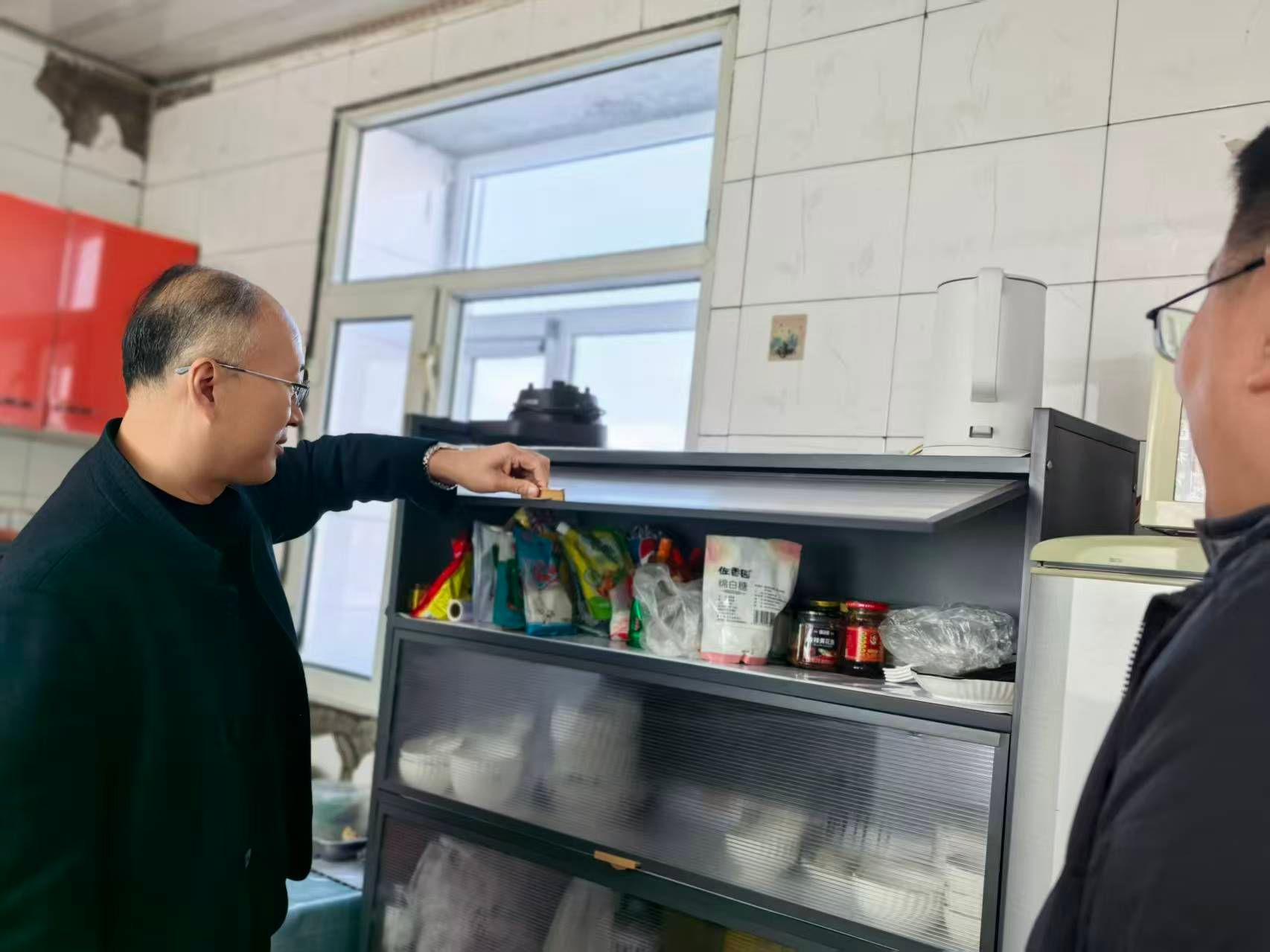 离开作坊,付强又来到驻村队员的住处。屋里干净亮堂、暖气烧得正旺。付强摸了摸热乎乎的炕头,看了看厨房——案板上摆放着学校这次带来的米、面、油、肉等生活物资。“这些是学校的一点心意,过日子都用得上”付强指着那些物资,语气家常,“住得暖、吃得好,干活才更有劲,心里才更踏实。有啥困难随时跟学校说,学校就是你们的后盾,但是——”他话锋一转,“你们也得把村里当自己家,把乡亲们当自家人。”