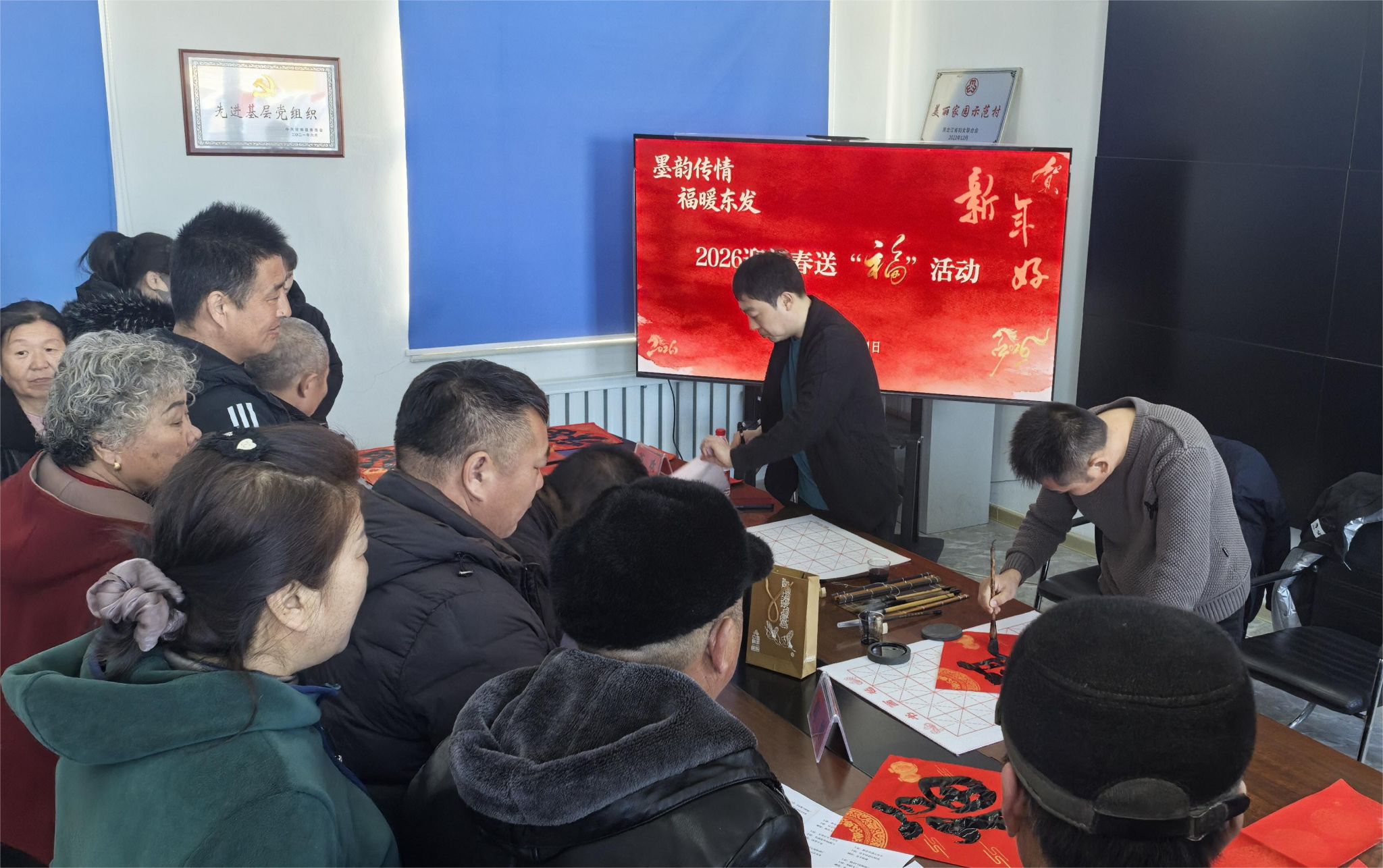 活动中,黑龙江省书法家协会会员陶旭、芦欢2位老师现场挥毫泼墨,为村民书写寓意吉祥的春联和“福”字,一幅幅饱含祝福的春联和“福”字跃然纸上。村民围在桌前,一边欣赏书法艺术,一边挑选心仪的作品,现场洋溢着欢乐祥和的节日氛围,活动累计为村民书写春联110余幅、“福”字300余张。两位书法家还手把手指导东发村孩子们写“福”字,让他们深入感受书法的魅力。贺景平还向村民和村干部现场发放成品春联150余幅,将美好的祝福送到村民手中。